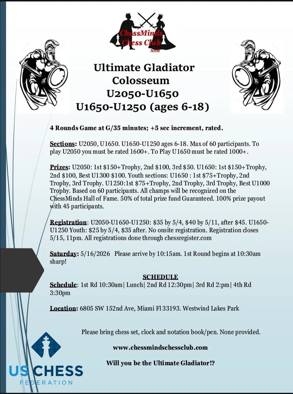 U2050-U1650 (Adults and Kids May Join) Youth U1650-U1250 (Ages 6-18 only) Saturday, May 16, 2026 10:30 AM 4:30 PM 6805 SW 152nd Ave Miami, FL, 33193 (map) Google Calendar ICS